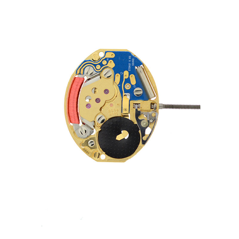ETA E03.001 Quartz Watch Movement is a 2 hand movement (hour/minute). This movement is a ladies oval shaped movement 5 1/2 x 6 3/4 ligne (13.00 mm x 15.15 mm) with a height of 1.40 mm, movement height H1. Plates are gold colour, 6 jewels, uses 335 battery. Hand dimensions are 100/55 (hour/minute).