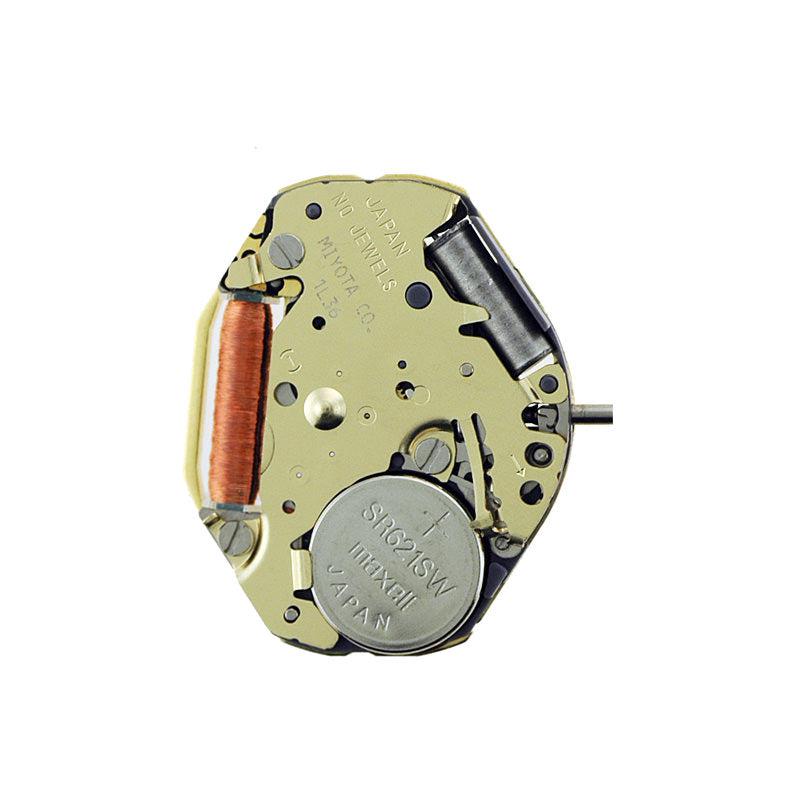 1L36 Miyota Quartz Watch Movement is a 3 hand movement (hour / minute / seconds) with high canon pinion and hour wheel. This ladies movement is a 6 3/4 ligne x 8 ligne movement, dimensions are 15.30 mm x 18.20 mm with a thickness of 2.28 mm, overall height 4.34 mm. Hand dimensions are 120/70/17 (h/m/s). 0 jewel movement, uses 364 battery. Stem use part number 065-477 (tap 0.90 mm / tap 10).