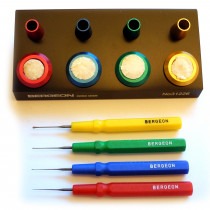 Bergeon 31226 Set Of 4 Oilers & Stand. Heavy duty synthetic non-slip plastic base, size 35mm x 80mm. Colour coded with 4 pithwood inserts. Swiss Made.